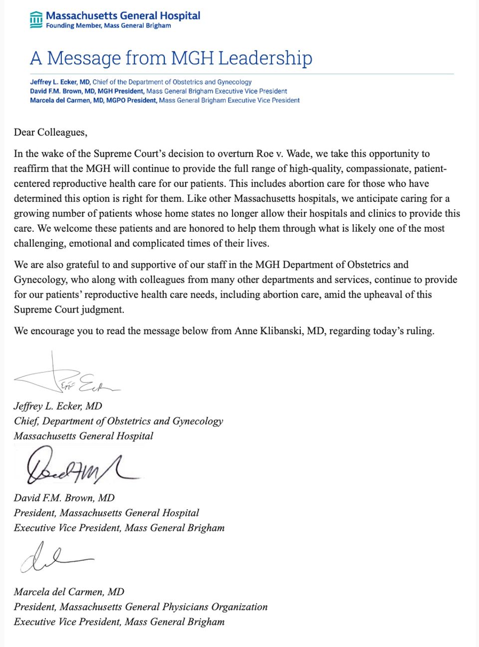 マサチューセッツ総合病院が病院関係者に送った文書。
