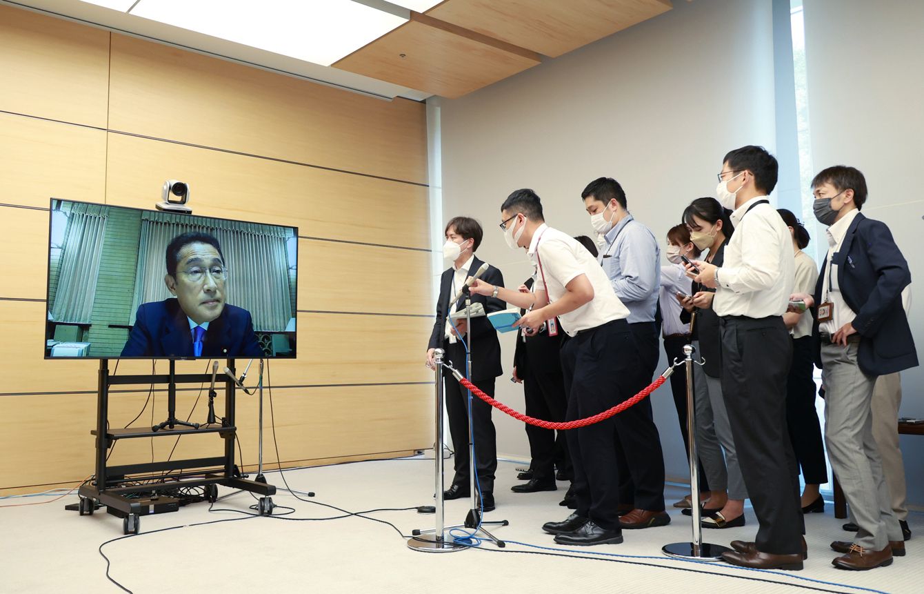 首相公邸からオンラインで記者団の取材に応じる岸田文雄首相(モニター画面)=2022年8月24日、首相官邸