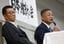 日本維新の会の新代表に選出され、記者会見する馬場伸幸氏(右)。左は松井一郎前代表=2022年8月27日、大阪市中央区
