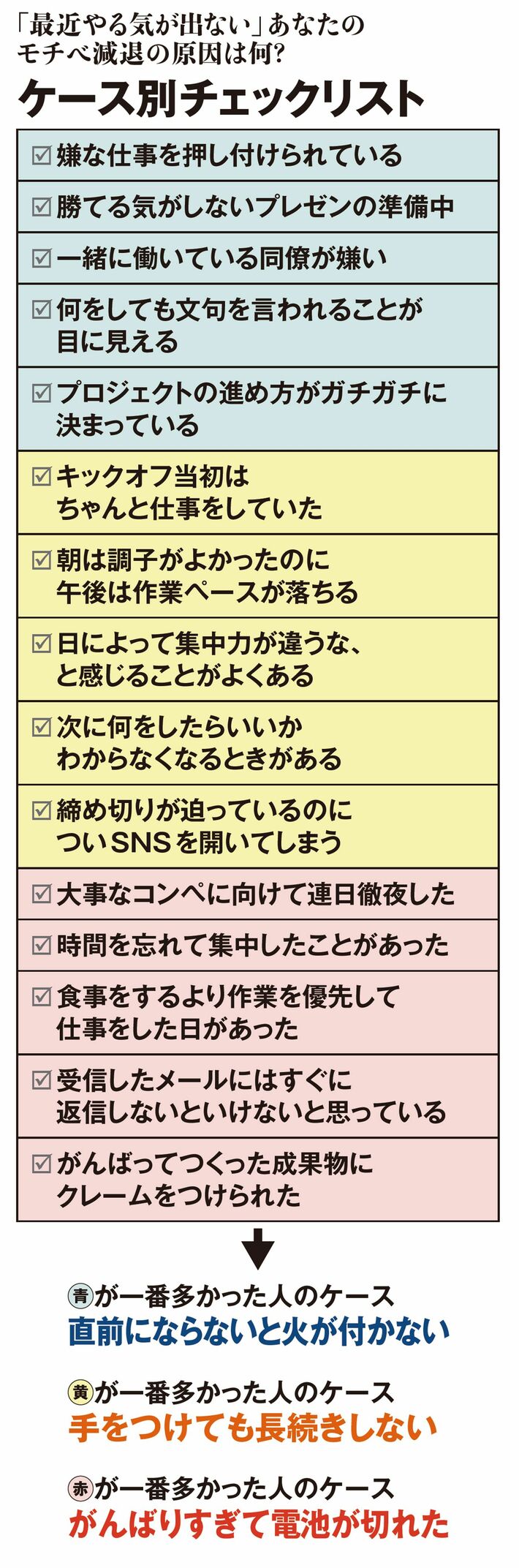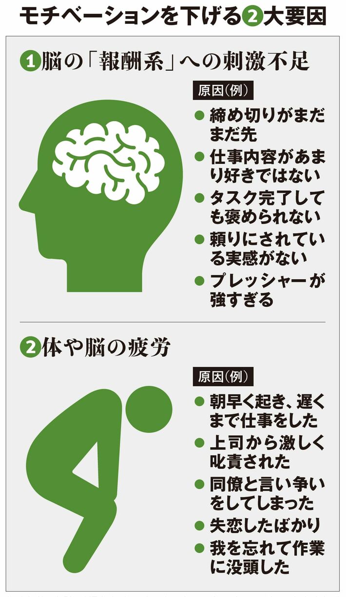 「ご褒美」を脳が得られないと、やる気はどんどん下がる。たとえ「ご褒美」があっても、疲れていては結局やる気はあがらない。