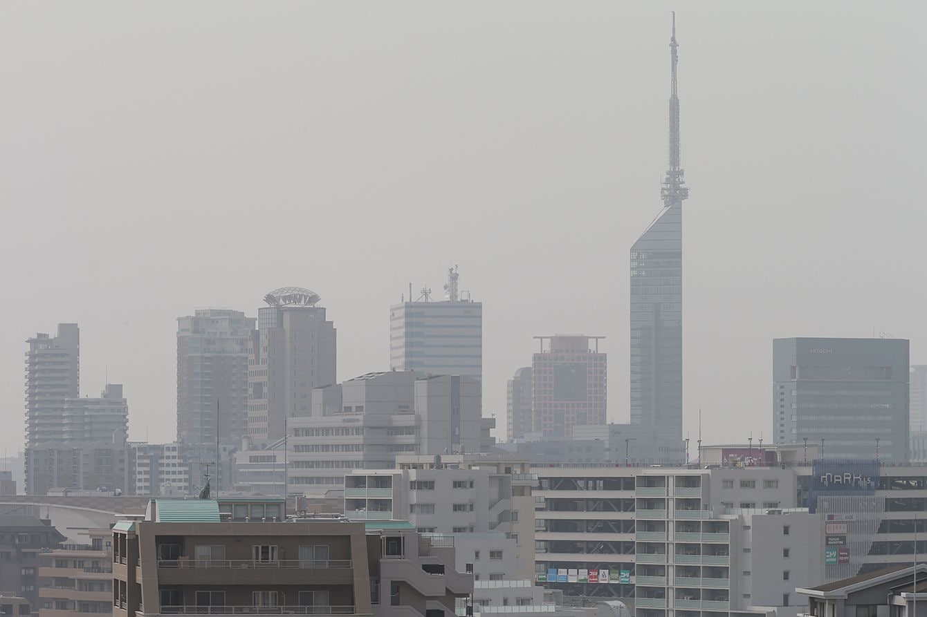 黄砂でかすむ福岡市街。右は福岡タワー=2021年3月29日