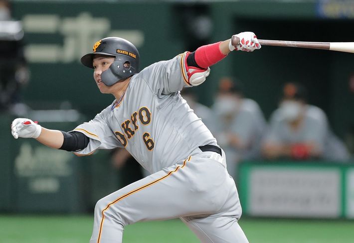 1回、適時二塁打を放つ巨人の坂本勇人=2022年7月5日、東京ドーム