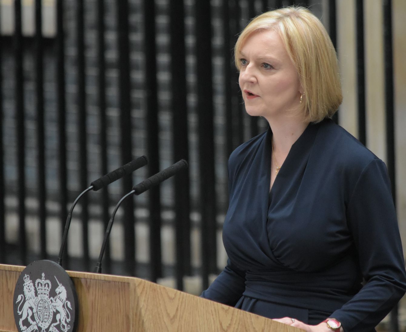 首相官邸前で就任演説を行うトラス首相(2022年9月6日)