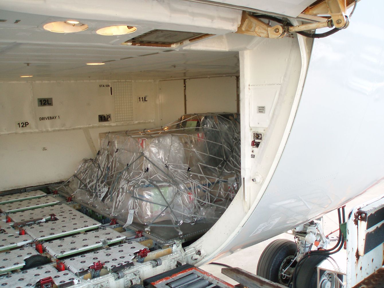 ANAのボーイング787-8の床下に搭載されるパレット貨物。