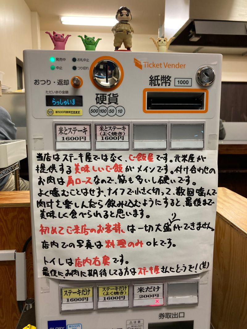 コメトステーキの券売機。「当店はステーキ屋ではなく、ご飯屋です」と手書きで書かれたメッセージが目を引く(筆者撮影)