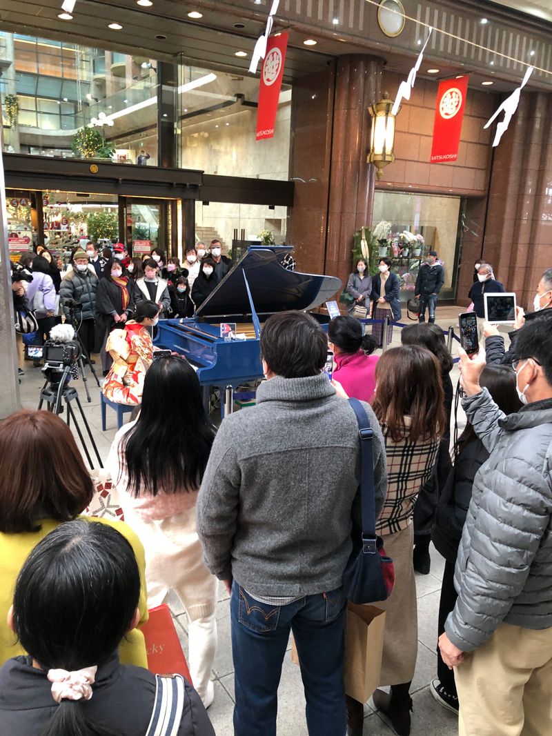正面玄関前に設置された「ミチナカピアノ」を楽しむ人々。改装前にあった三越の紫紺の暖簾は外され、商店街に一体感が生まれた=1月2日、松山三越前(写真提供=関係者)