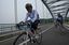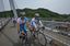 「しまなみ海道サイクリング」で並んで走る愛媛県の中村知事(左)と広島県の湯崎知事