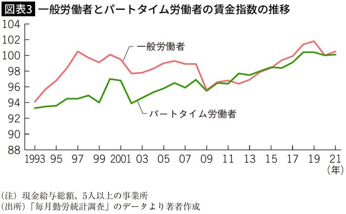 一般労働者とパートタイム労働者の賃金指数の推移 出所=『