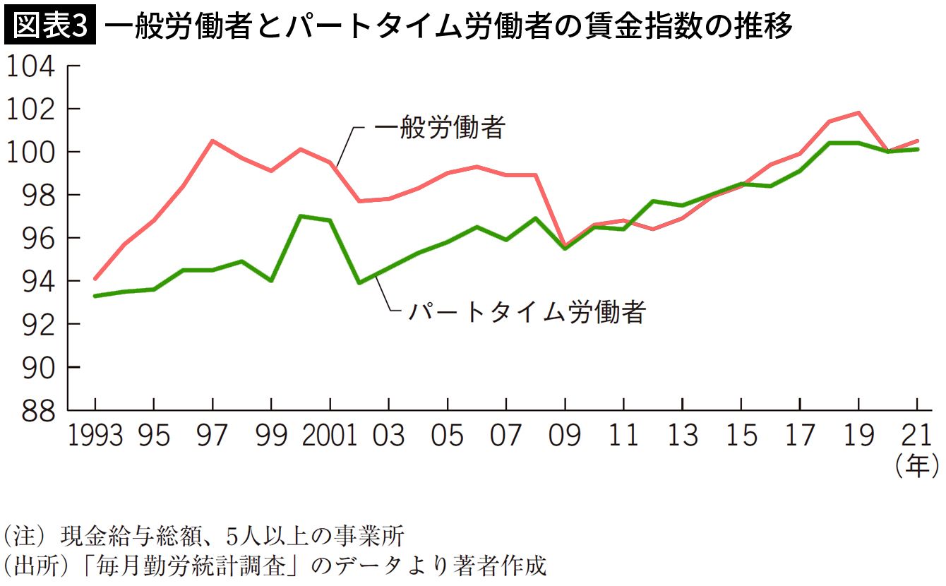 一般労働者とパートタイム労働者の賃金指数の推移 出所=『