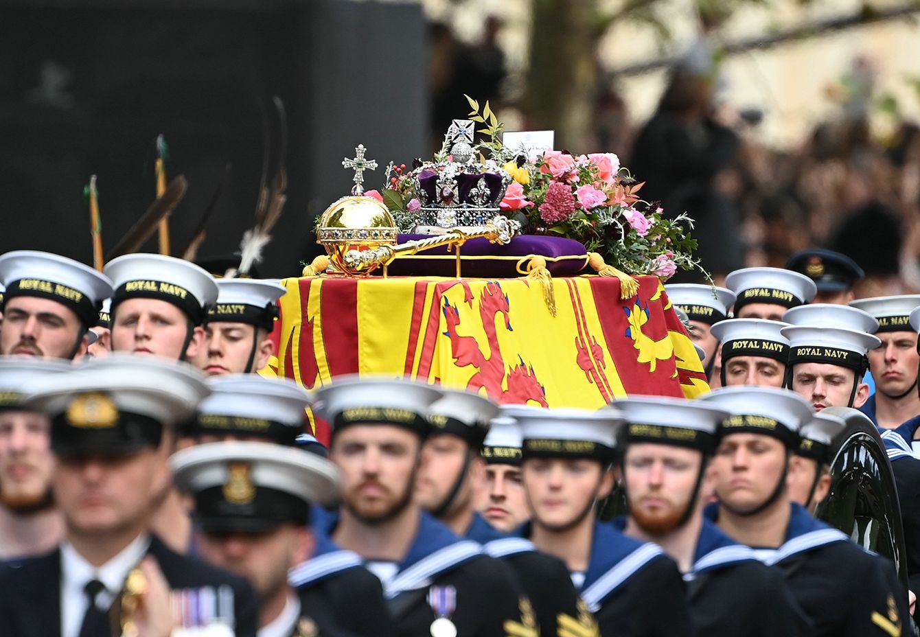 国葬後、ウィンザー城に向けて市中心部を進むエリザベス女王のひつぎ=2022年9月19日、イギリス・ロンドン