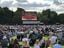 大型画面に映し出される棺が運ばれる様子を見守る人々