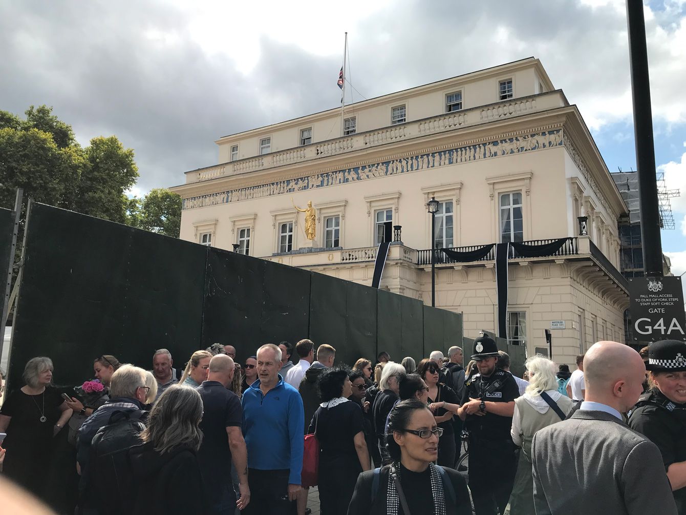 バッキンガム宮殿には多くの花束が手向けられていた
