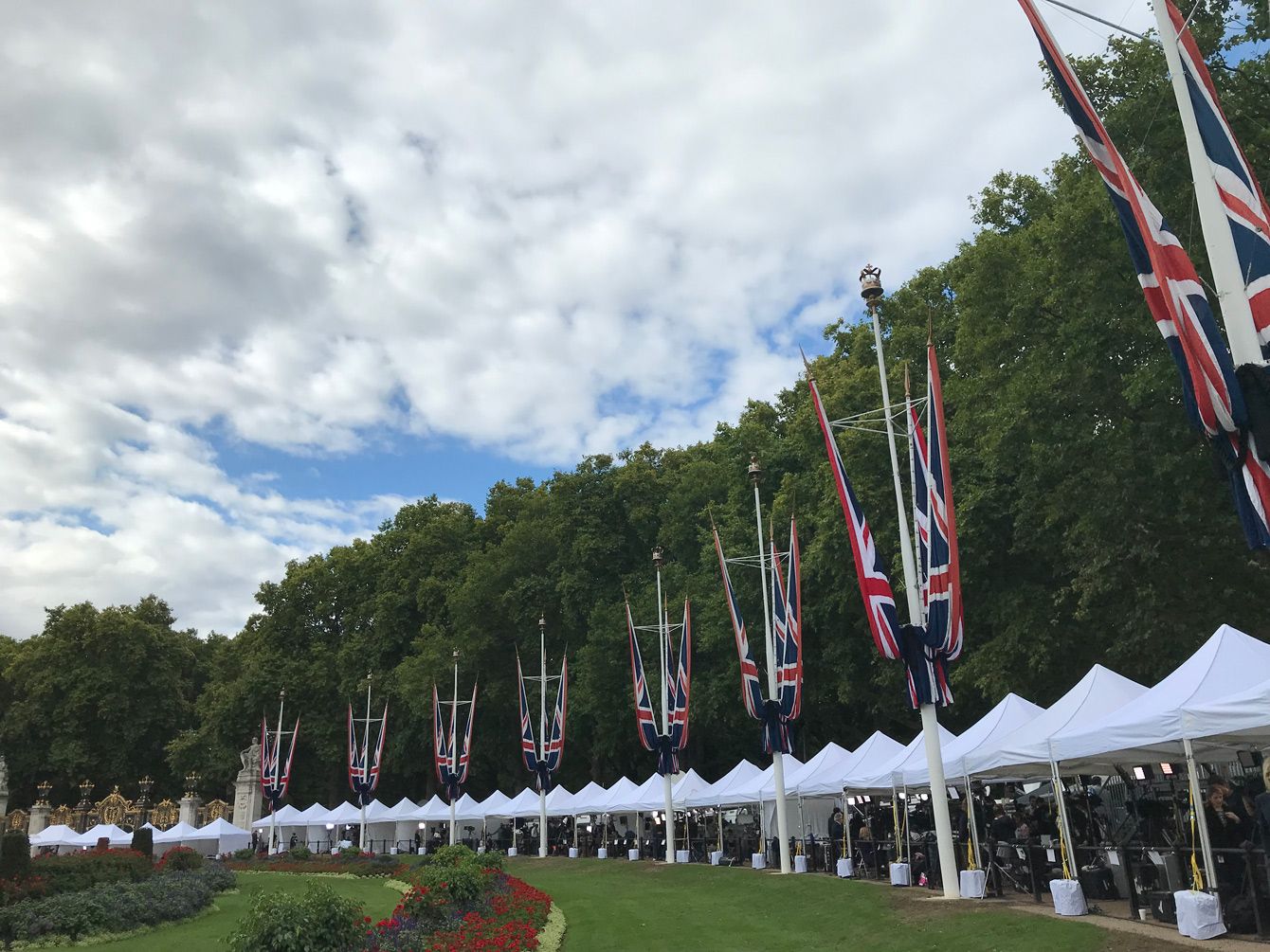 バッキンガム宮殿前に設置された各国TVのライブ仮設スタジオ