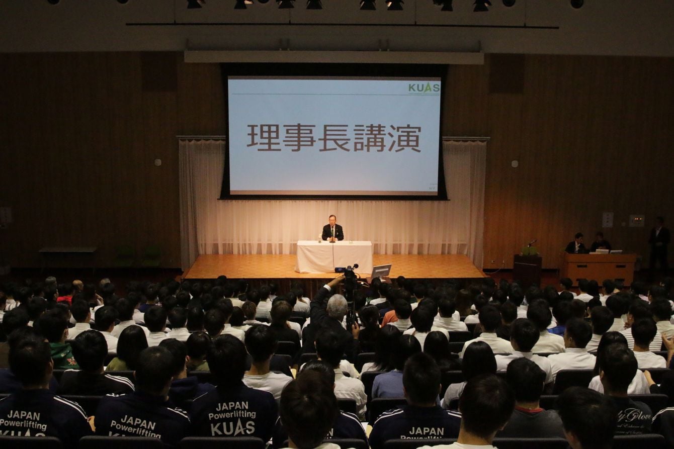 京都先端科学大学で講演をする永守重信日本電産会長兼永守学園理事長
