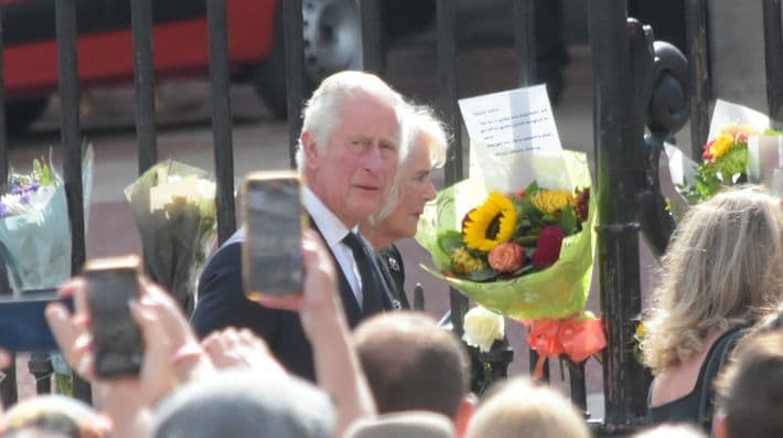 不人気は相変わらずのチャールズ国王とカミラ王妃(2022年9月9日、バッキンガム宮殿で筆者撮影)
