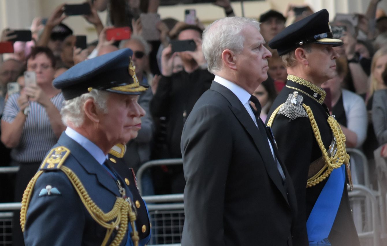王位継承では父チャールズ国王をウィリアム皇太子がサポートする姿が目立った(2022年9月17日、ランベス警察署で筆者撮影)