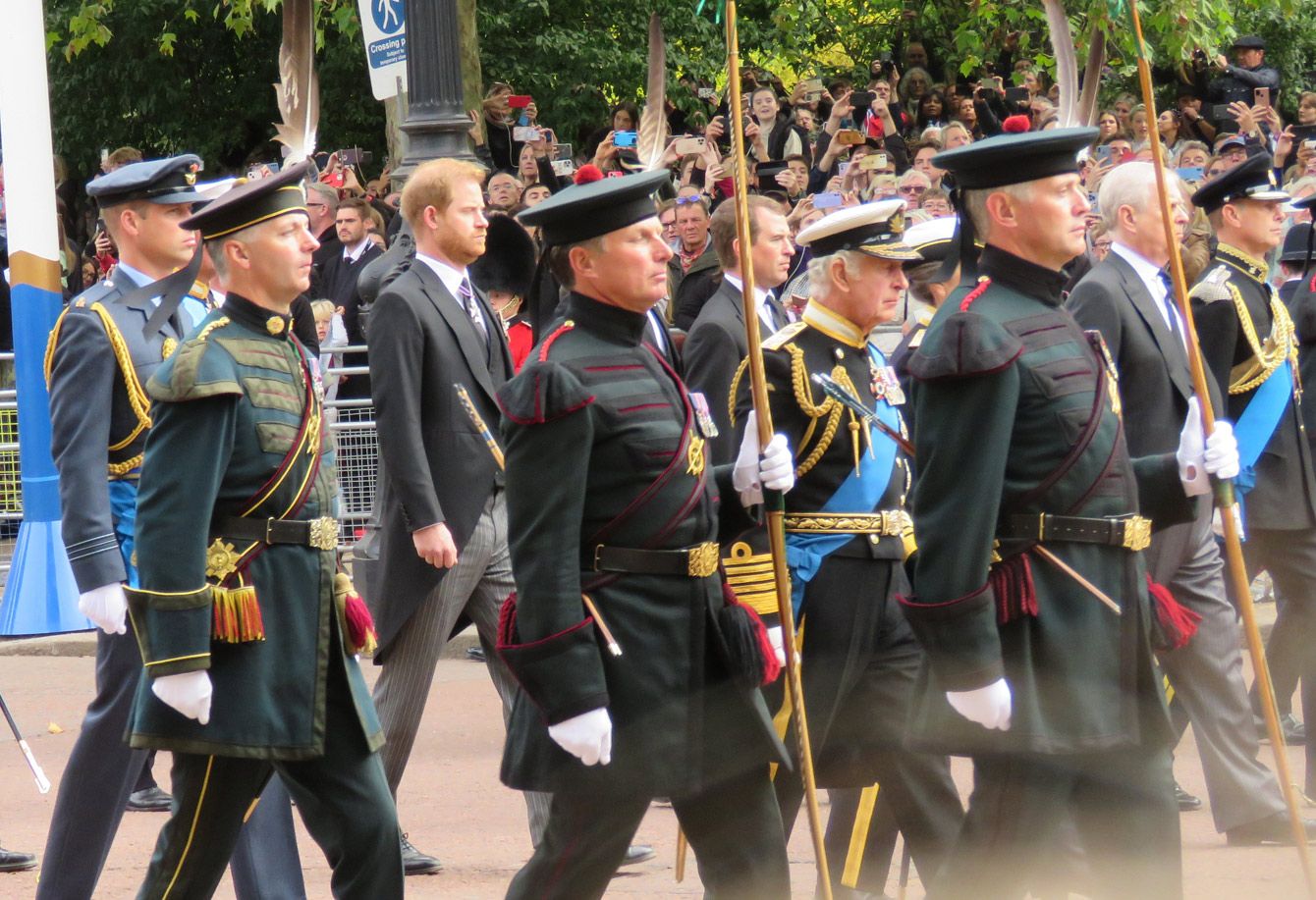 バッキンガム宮殿からウェストミンスター・ホールまで葬送行進するチャールズ国王(2022年9月14日、ザ・マルで筆者撮影)