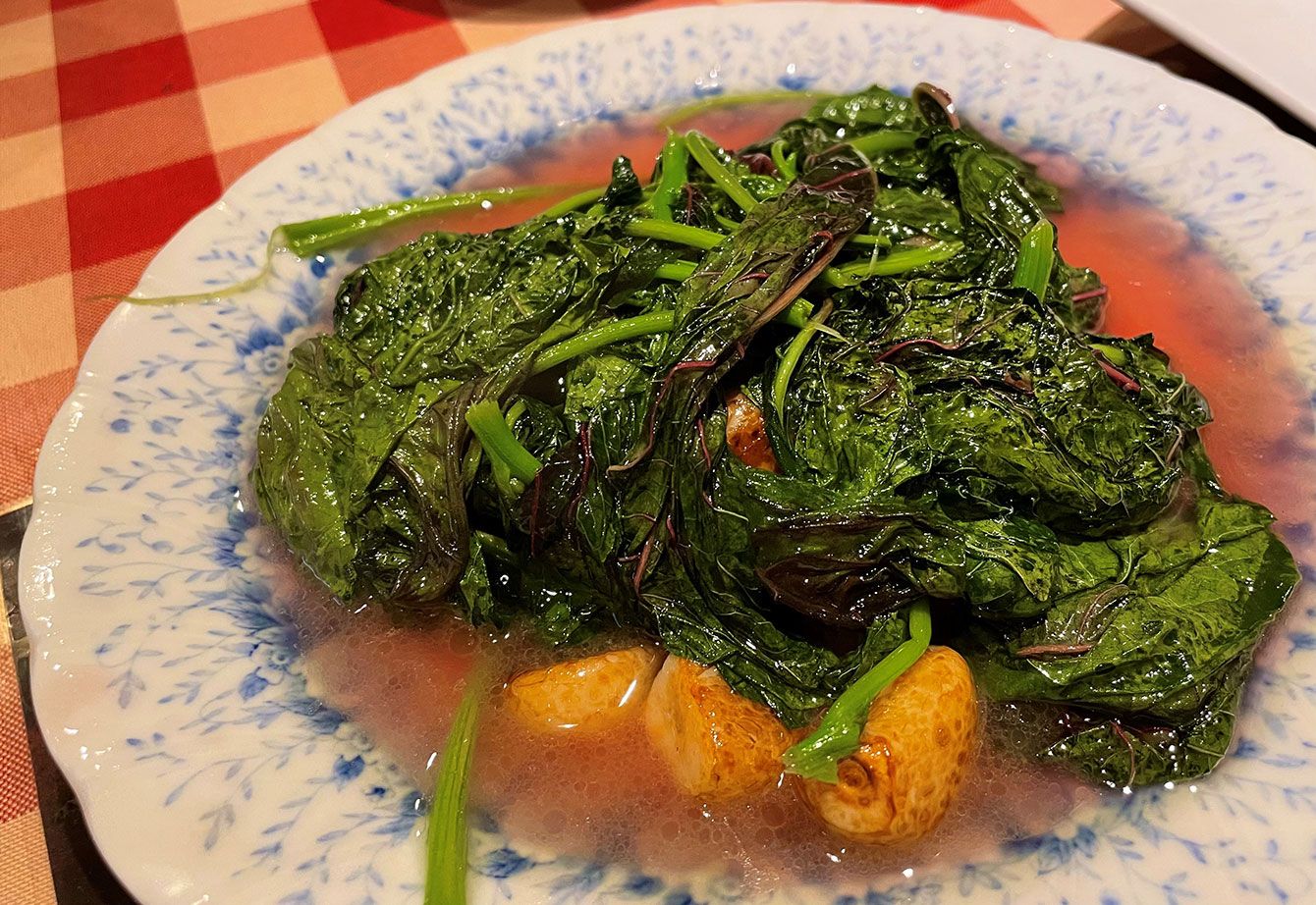 中国野菜「米莧」(通称「みし」)のにんにくと塩炒め。上海では庶民的な料理だが、さて、現地に住んだことがない日本人だけで来店してチョイスできますか……?
