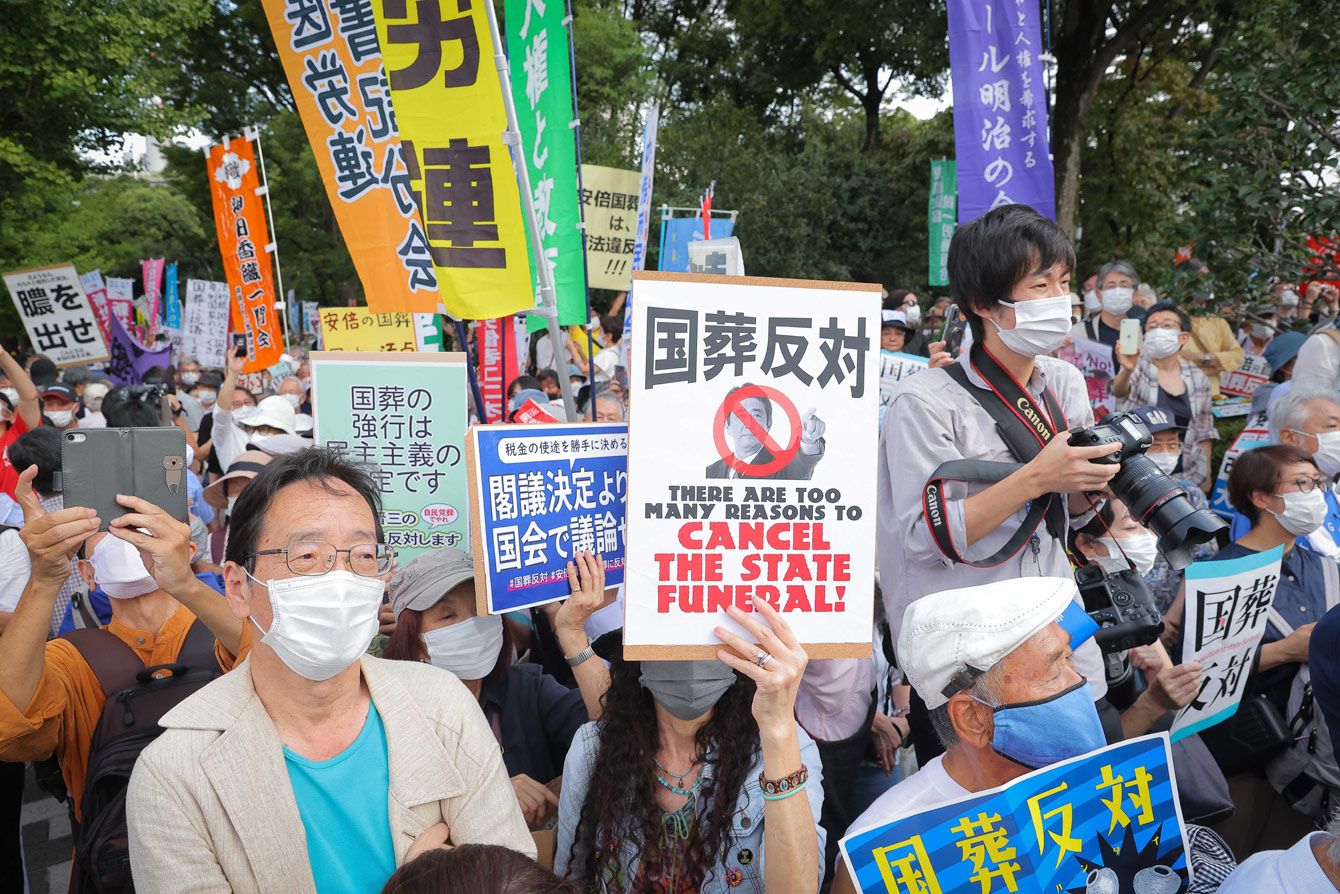 2022年9月27日、国会議事堂前(東京)にデモ隊が集まり、安倍晋三元首相の国葬を政府が決定したことに不満を表明した。
