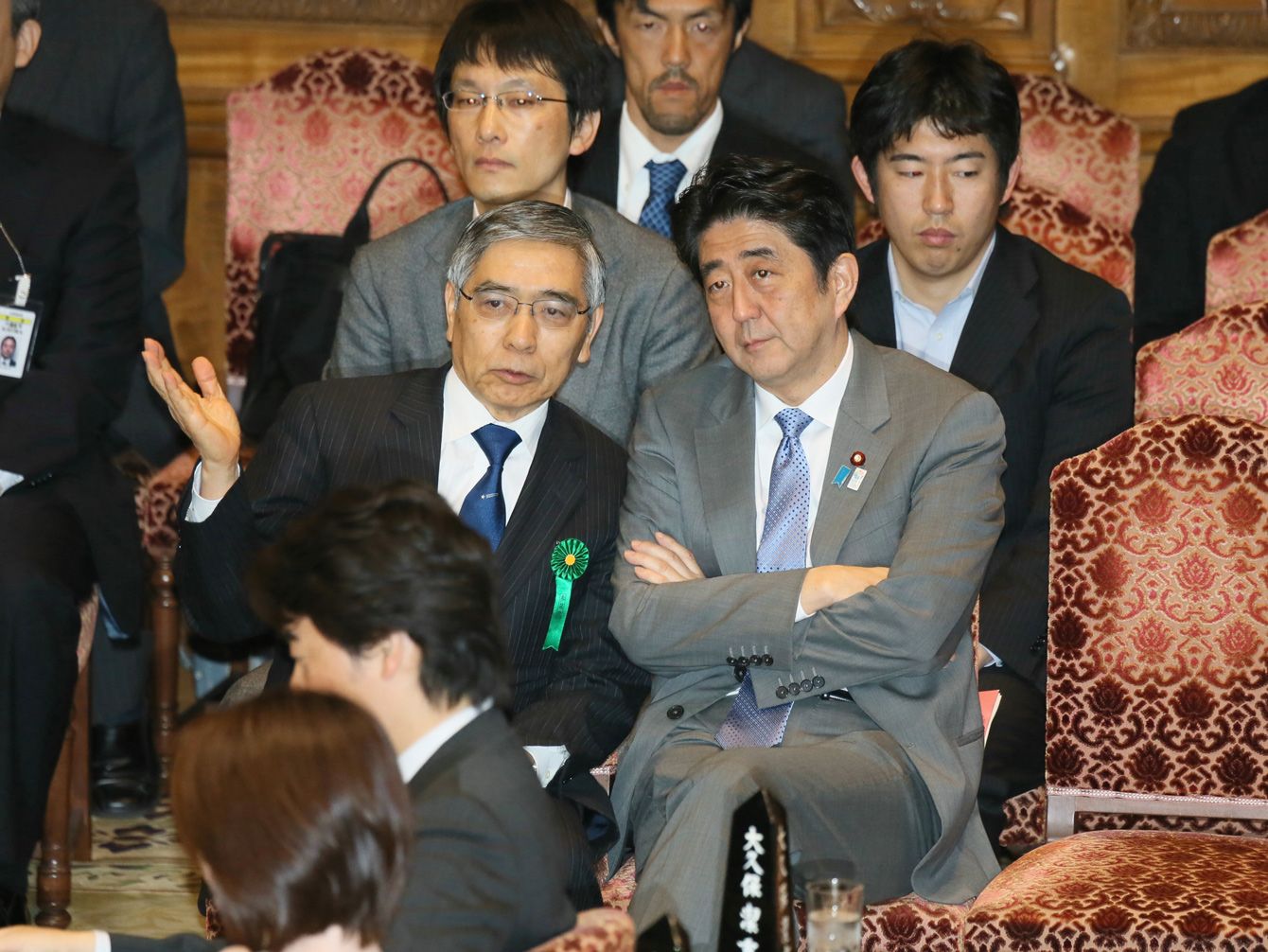 参議院予算委員会の開会前に言葉を交わす安倍晋三首相(右)と黒田東彦日銀総裁=2013年5月8日、東京・国会内