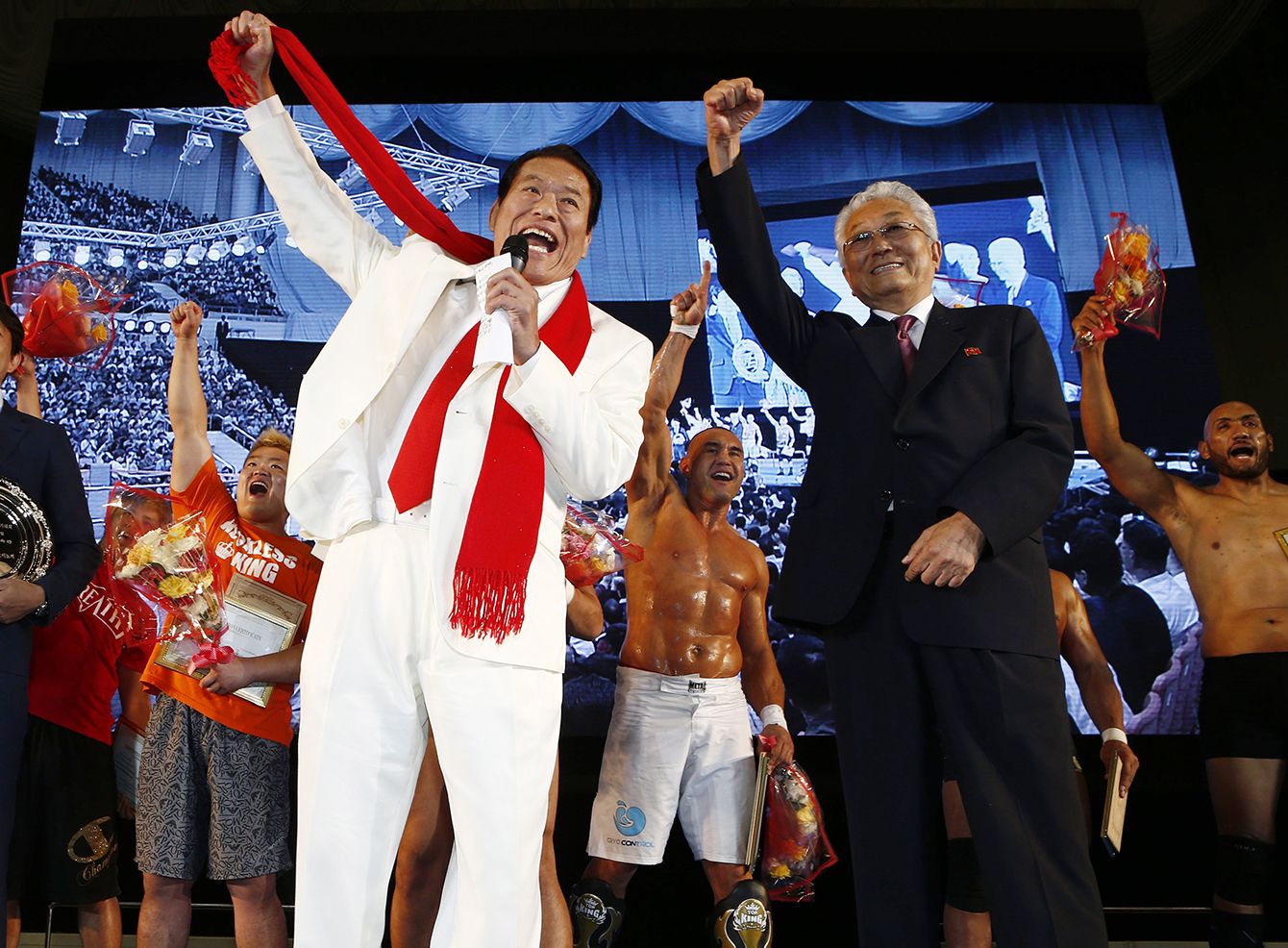 北朝鮮の平壌で開催された国際プロレス大会が閉幕し、あいさつを終えて気勢を上げるアントニオ猪木参議院議員(手前左、次世代の党)ら。=2014年8月31日