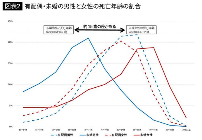 有配偶・未婚の男性と女性の死亡年齢の割合