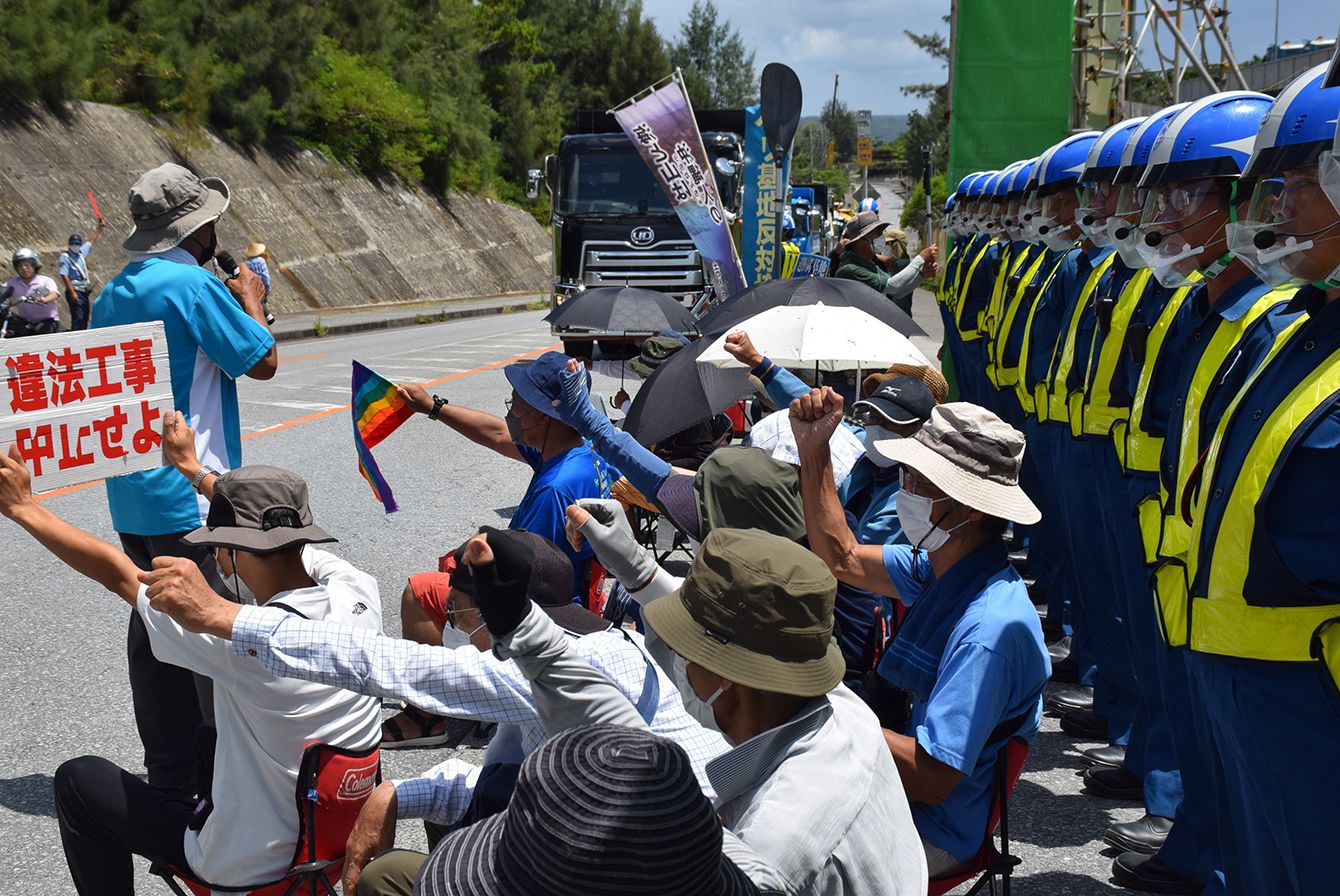 米軍普天間飛行場(宜野湾市)の名護市辺野古移設で、埋め立て用の土砂が搬入される米軍キャンプ・シュワブのゲート前に座り込んで抗議する人たち=2022年8月25日、沖縄県名護市