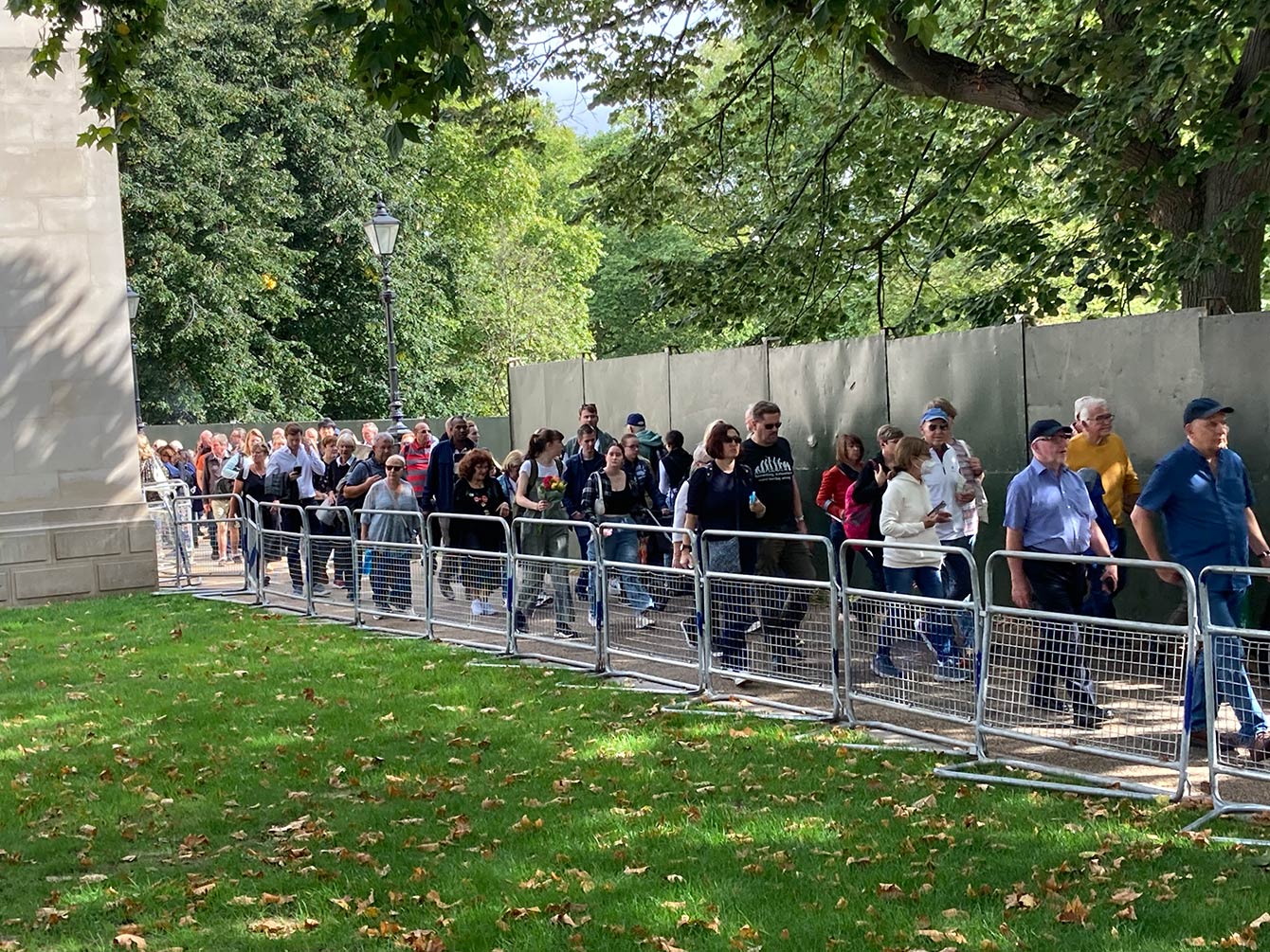 ハイドパーク内の公園に特設されたテレビスクリーン前にも、女王の死を悼む大勢の人が