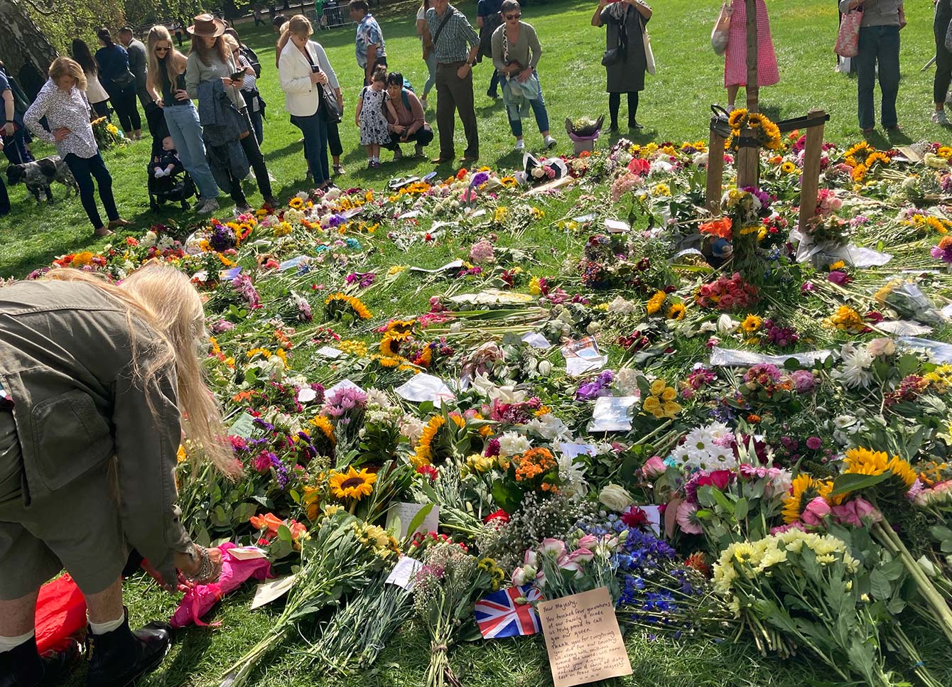 ハイドパーク内の公園に特設されたテレビスクリーン前にも、女王の死を悼む大勢の人が