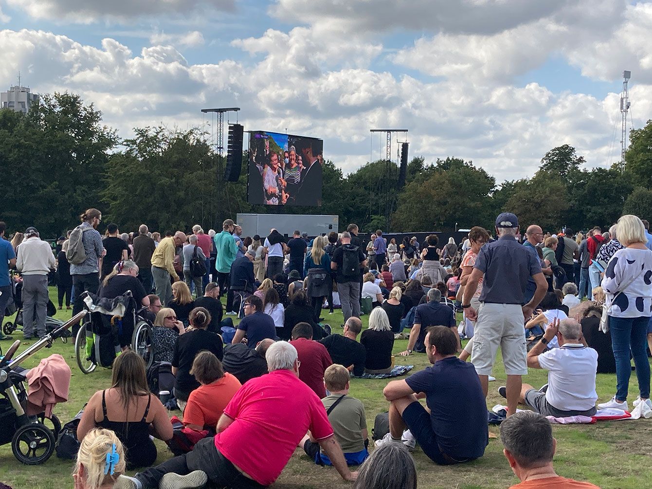 ハイドパーク内の公園に特設されたテレビスクリーン前にも、女王の死を悼む大勢の人が