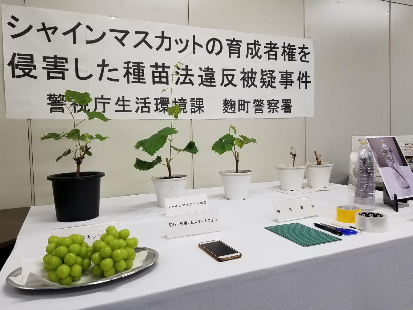 シャインマスカットの苗木が無許可で保管されていた事件で、書類送検された男性から押収した苗木=2021年6月28日、東京都千代田区の警視庁麹町署