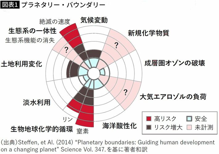 プラネタリー・バウンダリーの図。生物地球化学的循環(窒素、リン)と生態系の一体性(絶滅の速度)が高リスクと評価されている(出所=『