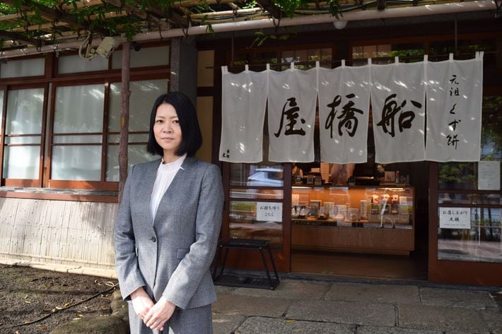 船橋屋の社長に就任した神山恭子(旧姓:佐藤恭子)さん。東京都・亀戸にある本店前で