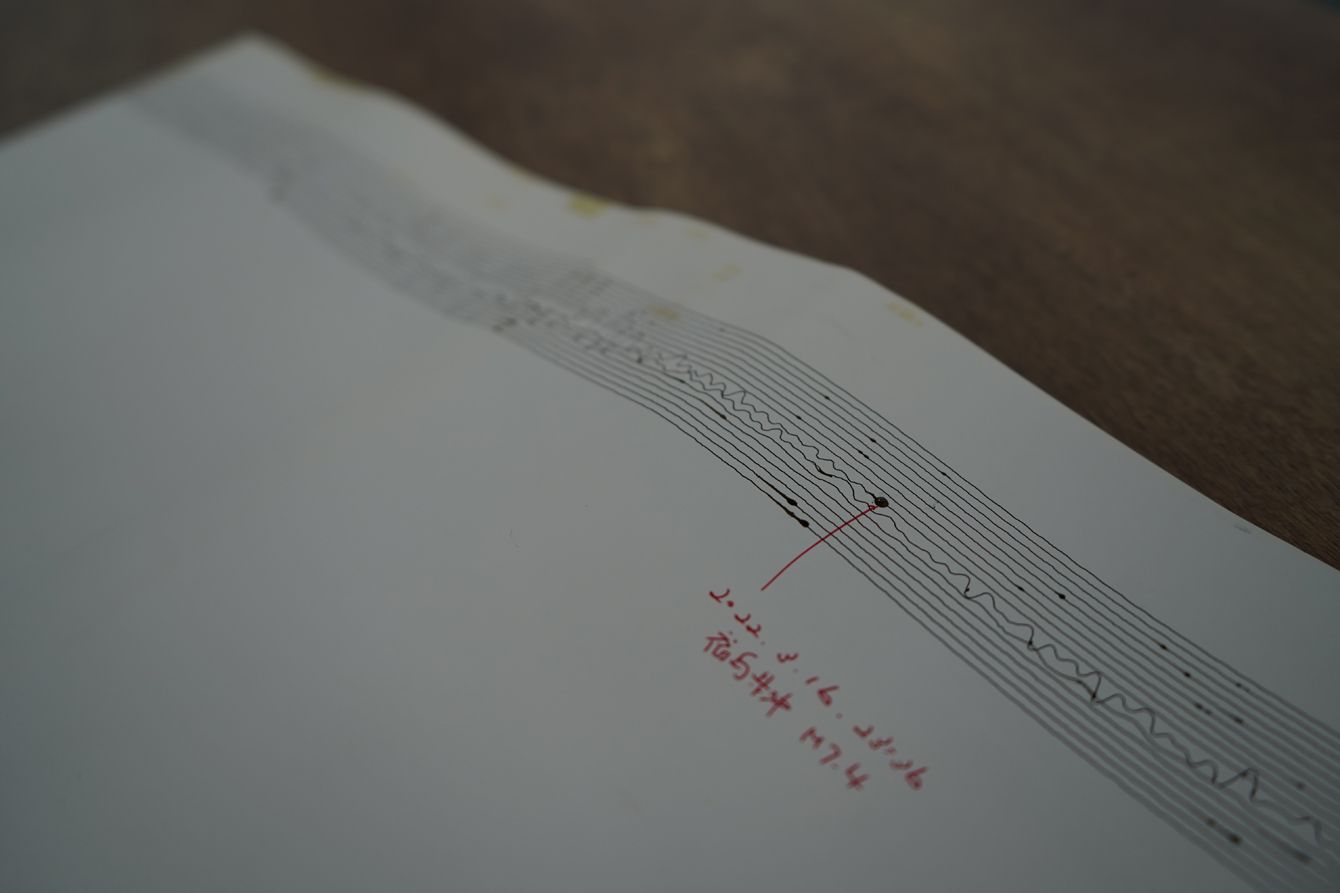 こちらは、ウェザーニューズ入社後に自作した地震計の記録紙。一から設計し組み立てることで、プロユースの計測装置における工夫点や盲点が見えてくることもあるという。