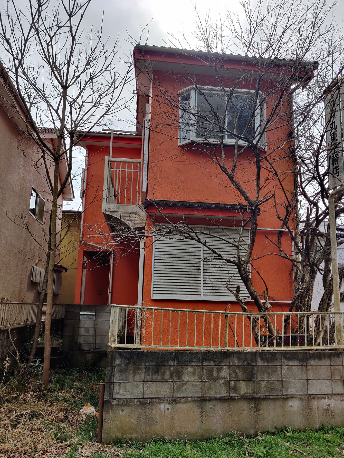バルコニーが崩落したまま、修繕されることもなく放置されている。竹林に埋もれた空き家の隣家である。(千葉県山武市横田)