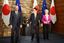 定期協議に臨む岸田文雄首相(中央)。左は欧州連合(EU)のシャルル・ミシェル大統領。右はウルズラ・フォンデアライエン欧州委員長=2022年5月12日午前、首相官邸