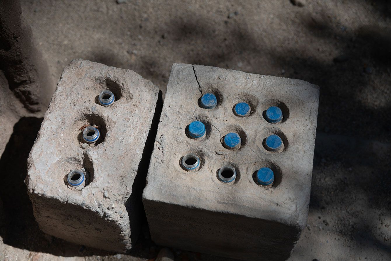 さまざまな塗料と素材を日光に当て、「(蓄熱効果の)