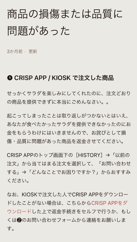 CRISPのヘルプページにある注意書き。「品質に問題」という項目について「注文どおりの商品を提供できずに本当にごめんなさい。。」としている。