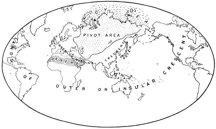 ハルフォード・マッキンダーの地政学概念を示す図。(出典=Halford J. Mackinder, "The Geographical Pivot of History", Geographical Journal 23, no. 4 (April 1904)/CC-PD-Mark/