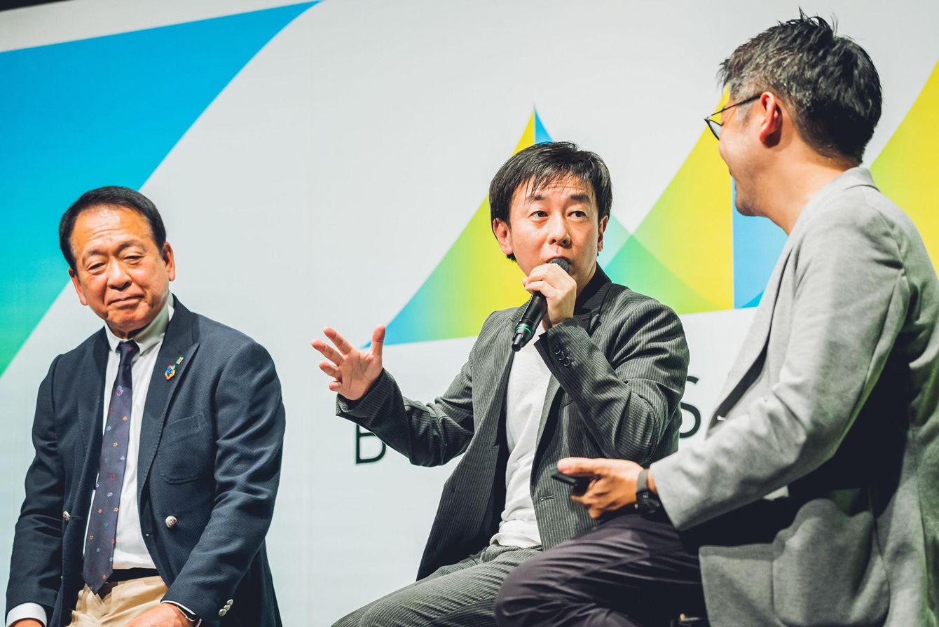 ステージで対談中のサイボウズ社長、青野氏(中央)