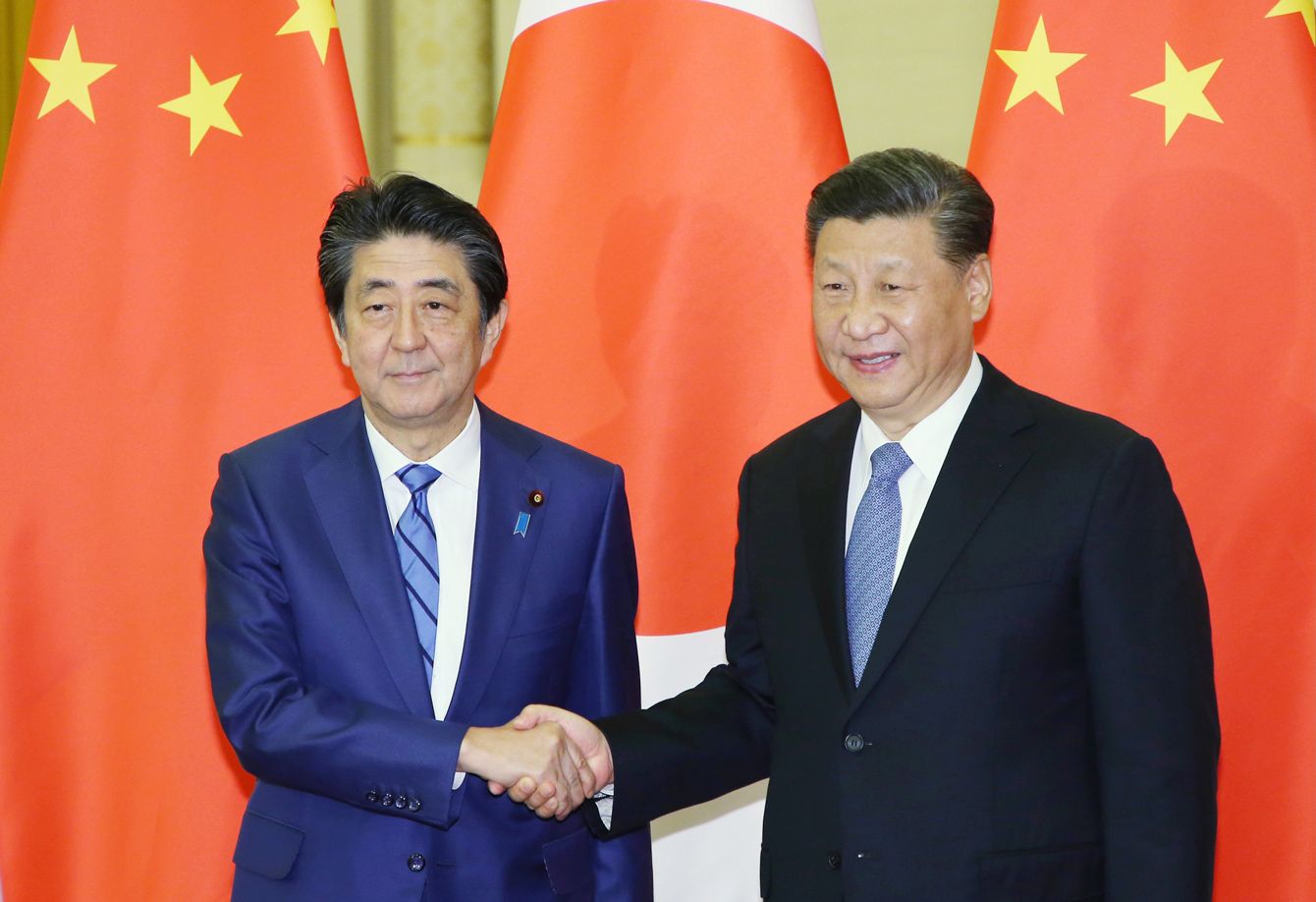 会談を前に握手する安倍晋三首相(左・当時)と中国の習近平国家主席=2019年12月23日、中国・北京の人民大会堂