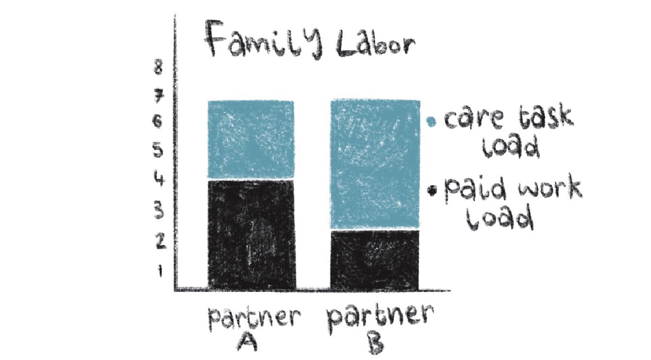 家族の労働の比較。パートナーAは石炭の採掘、パートナーBはケアタスク。KC・デイビス『