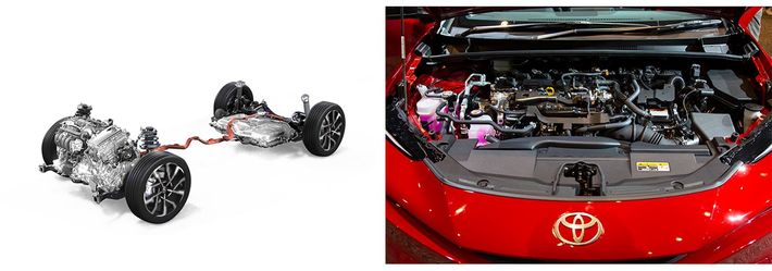 (左)プラグインハイブリッドシステム(2.0Lプロトタイプ)、(右)エンジンルーム