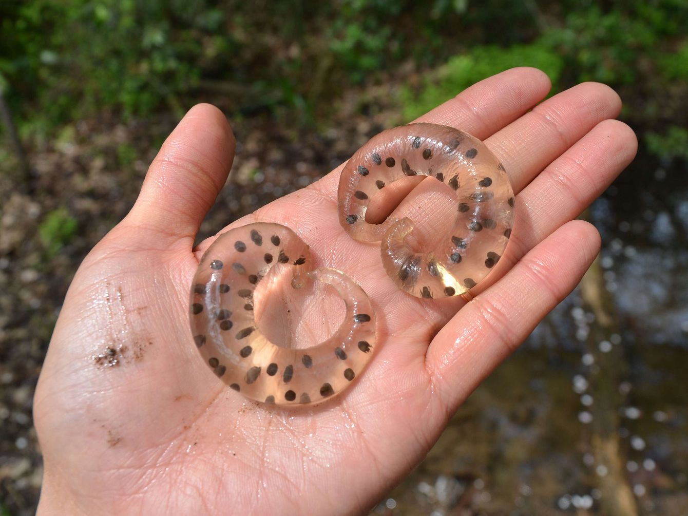 【写真4】トウキョウサンショウウオの卵のう。バナナ状の膜の袋の中に何十粒もの卵が入っている(出所=『