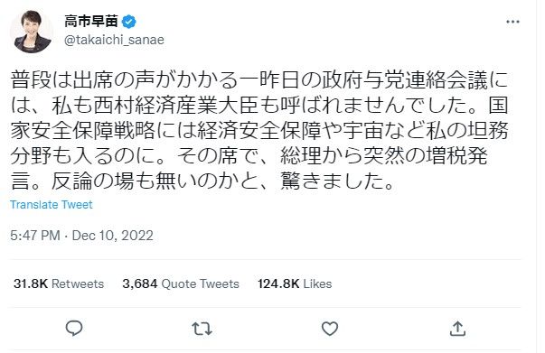 高市早苗氏のツイッター。「反論の場も無いのかと、驚きました」と岸田首相の増税方針に異論を唱えた。
