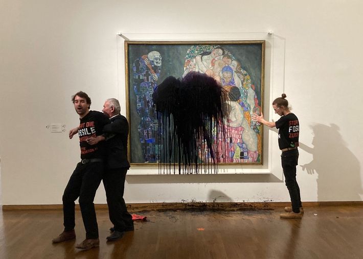 オーストリア・ウィーンのレオポルド美術館で、オーストリア人画家クリムトの絵画「死と生」に黒い液体をかけた気候活動団体「ラスト・ジェネレーション」が制圧されている様子=2022年11月15日