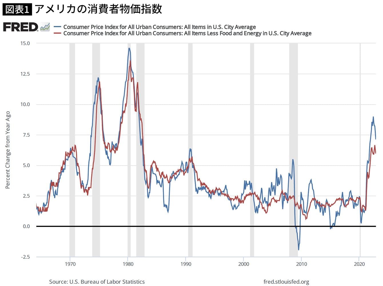 出典=米国労働統計局、都市消費者の消費者物価指数:米国都市平均の全ての項目 [CPIAUCSL]、