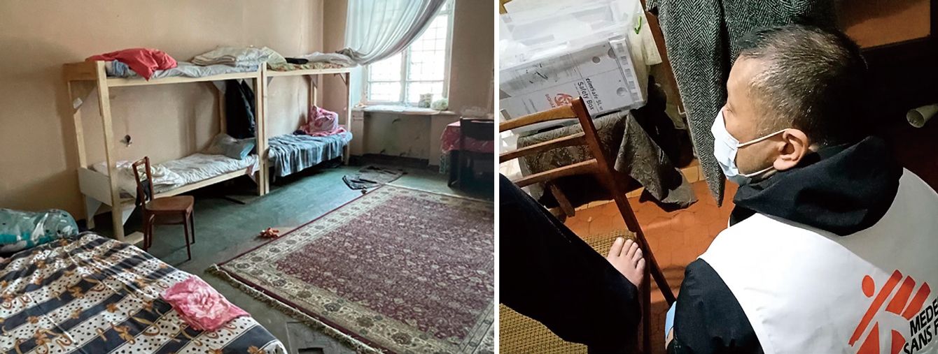 3月26日ドニプロの避難所にて。マリウポリから逃れてきた人たちに対し、急きょ頼まれて診察を引き受けた。5歳の子供から80代の高齢者まで計9人を診察。高齢の男性は1週間続いた避難生活で靴を脱げなかったため、足に潰瘍ができていた。出典=『