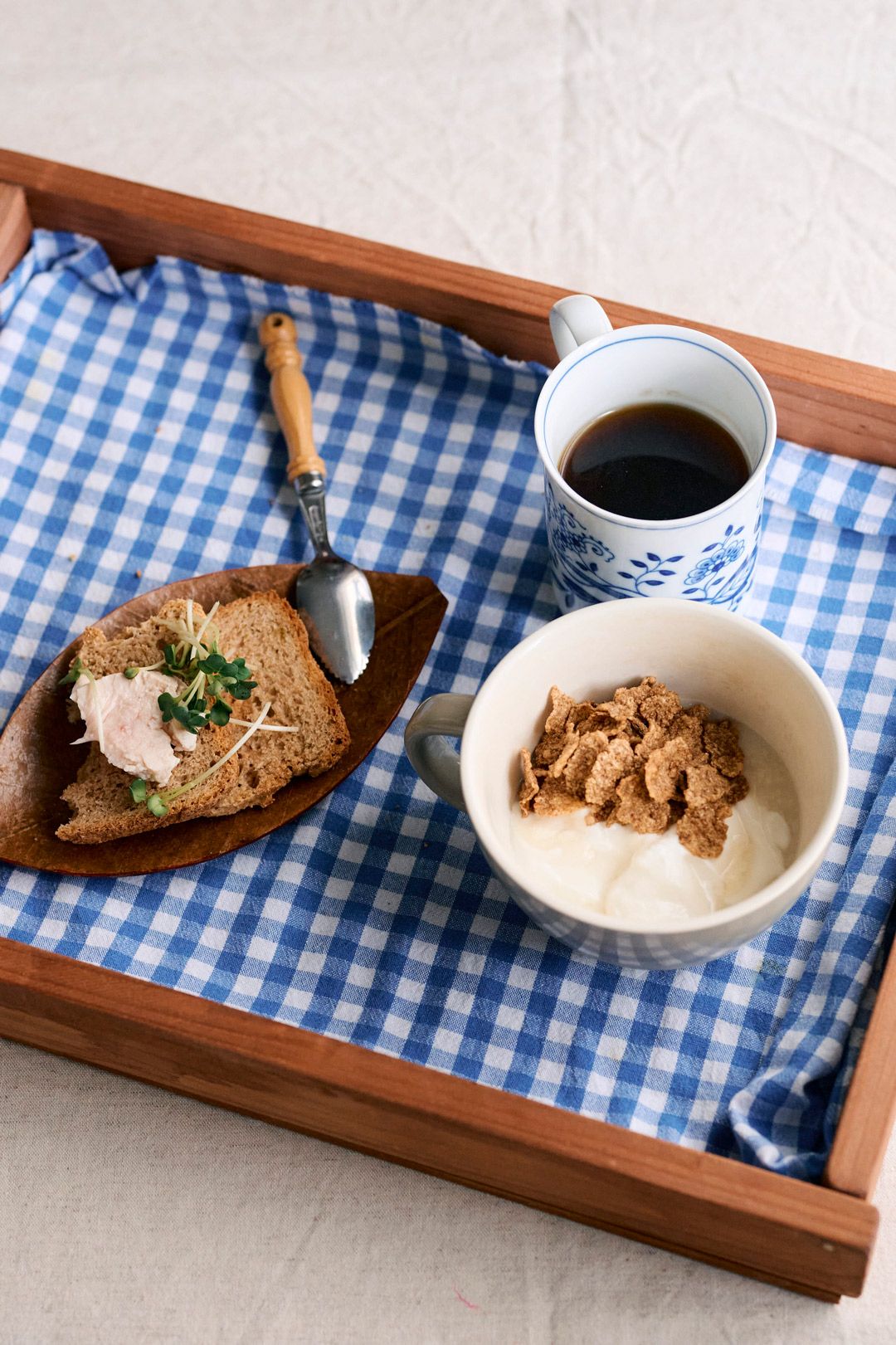 紫苑さんの朝ご飯。毎朝自家製ヨーグルトに甘酒とシリアルをプラスして。自家製パンに鶏ハムなど前夜の残りをのせたオープンサンド、コーヒーで約50円