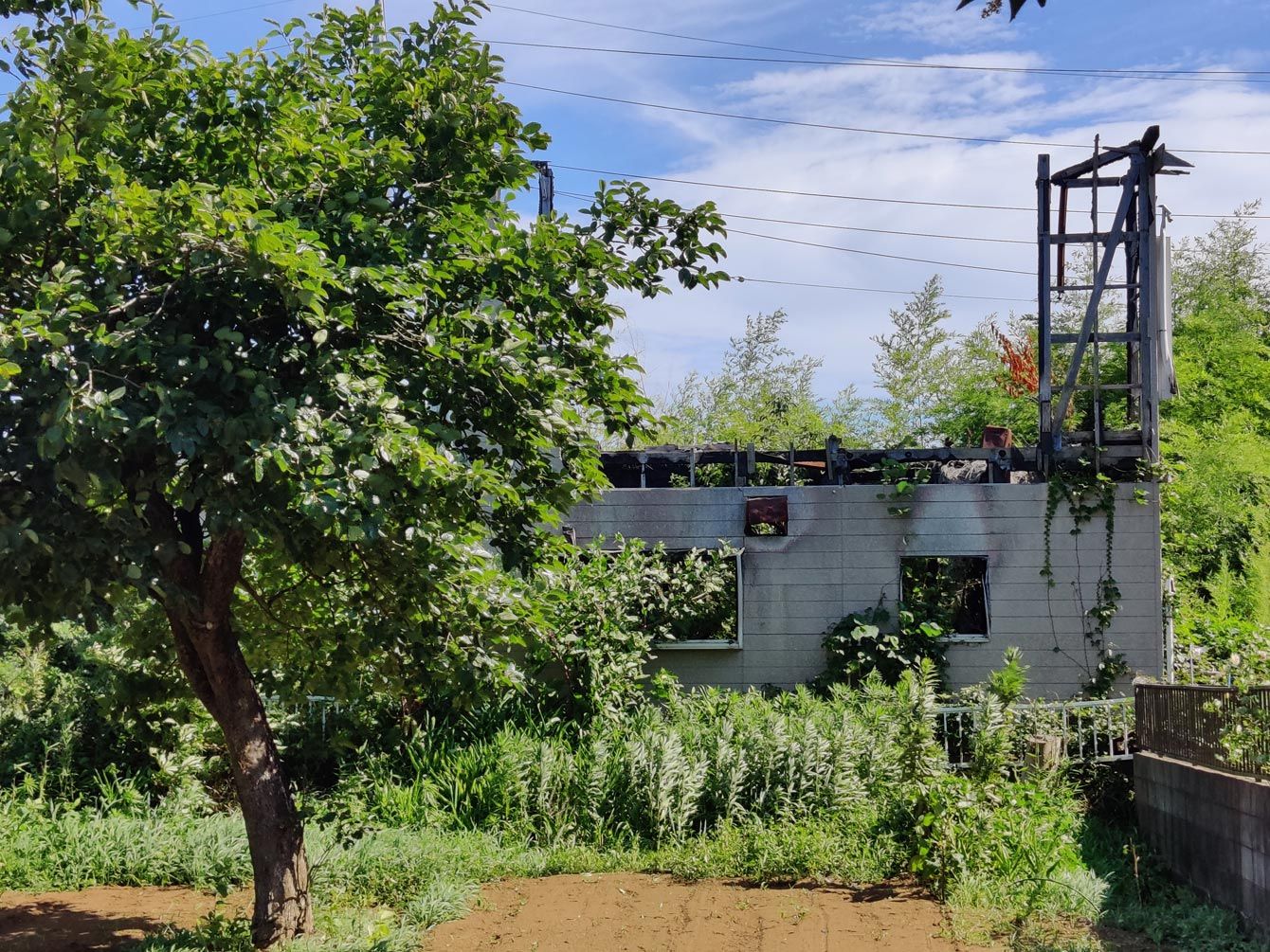 半焼後、そのまま放置されている家屋。地価が安く解体費用の回収が見込めない限界分譲地では、被災家屋の撤去も進まない。